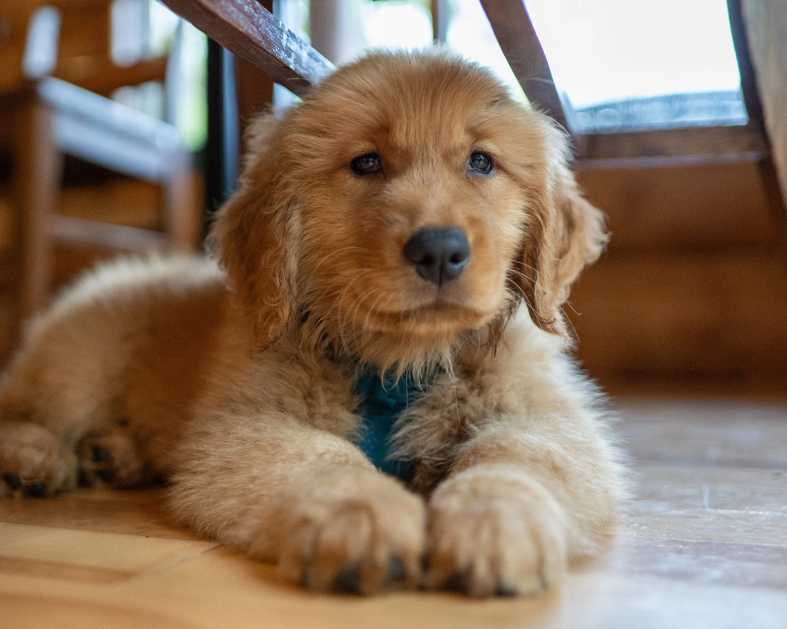The Golden Retriever’s mouth is closed, her ears are up, and there’s more tension in her face. Her posture is slightly more controlled.