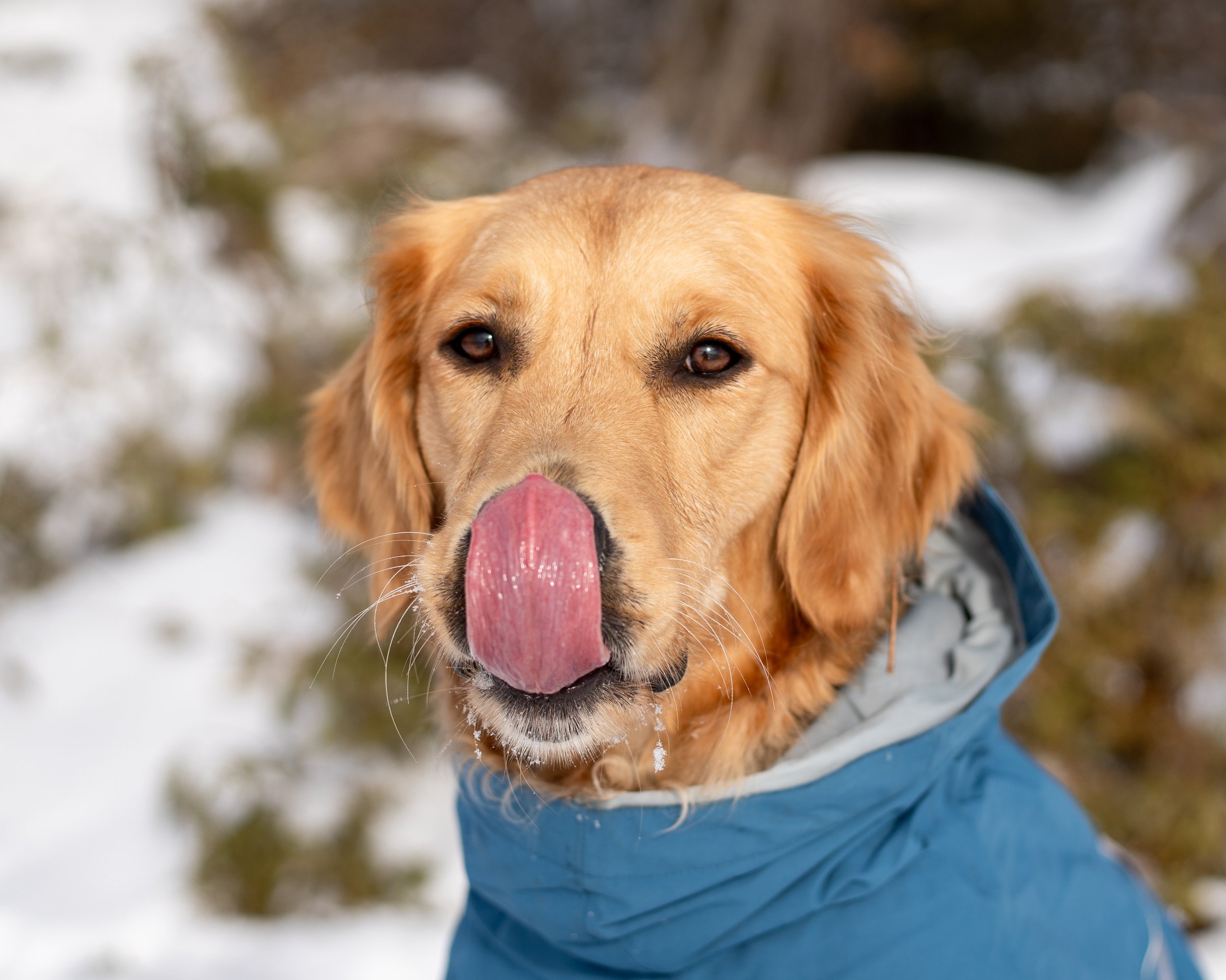 Puppies often lick or nuzzle around the mouths of older dogs during close social interactions. In these photos, Hazel is a puppy and young teenager greeting two senior dogs she has known since she was a wee baby. Both dogs are extremely tolerant and get along well with all sorts of personalities. We spent a lot of time hiking and camping together over the years, so these dogs are familiar and important parts of her social world.