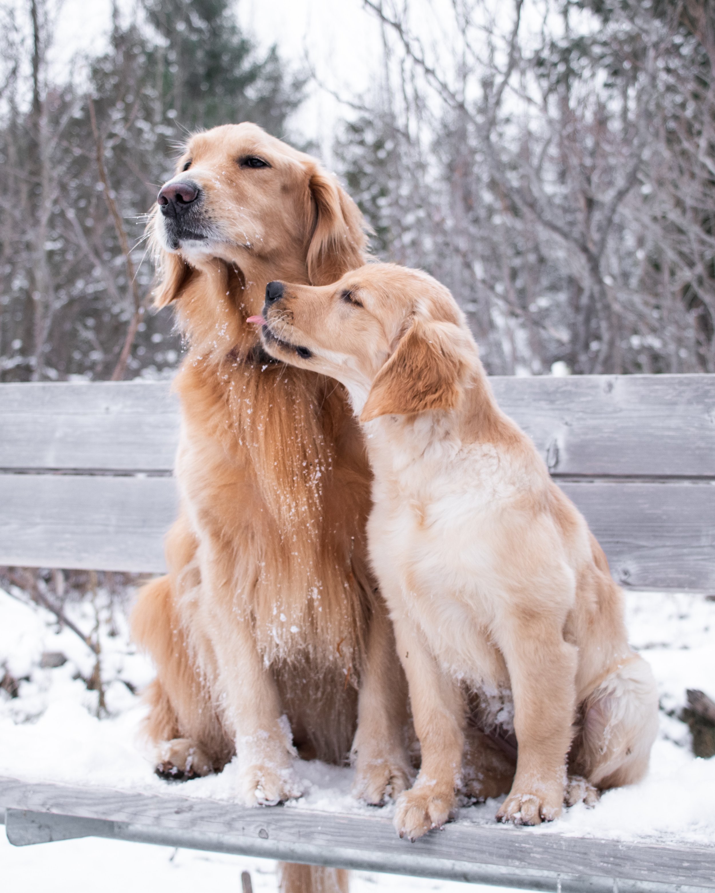 You can see Hazel stretching up toward the older dogs’ faces to lick around the muzzle. Her body remains loose and relaxed while she repeatedly nudges and licks at their mouths. It’s giving “I’m sorry my mom made me sit here” vibes.
