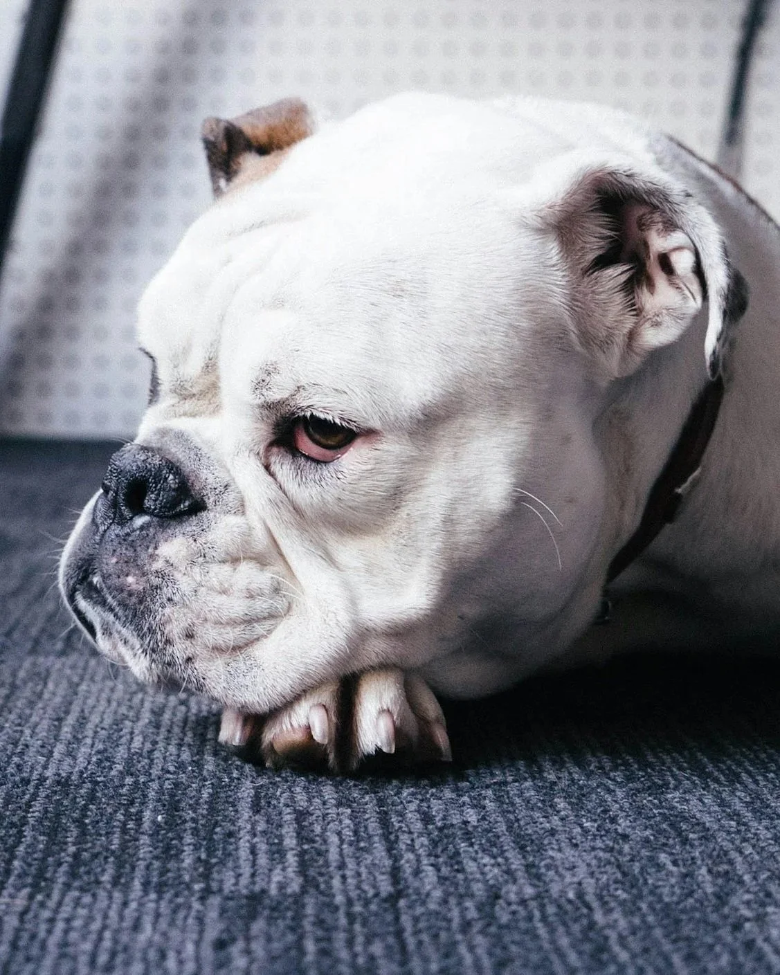 Whale eye happens when a dog turns their head away but keeps their eyes fixed on something, causing the whites of the eyes to become visible. It can appear when a dog feels stressed, anxious, or afraid.