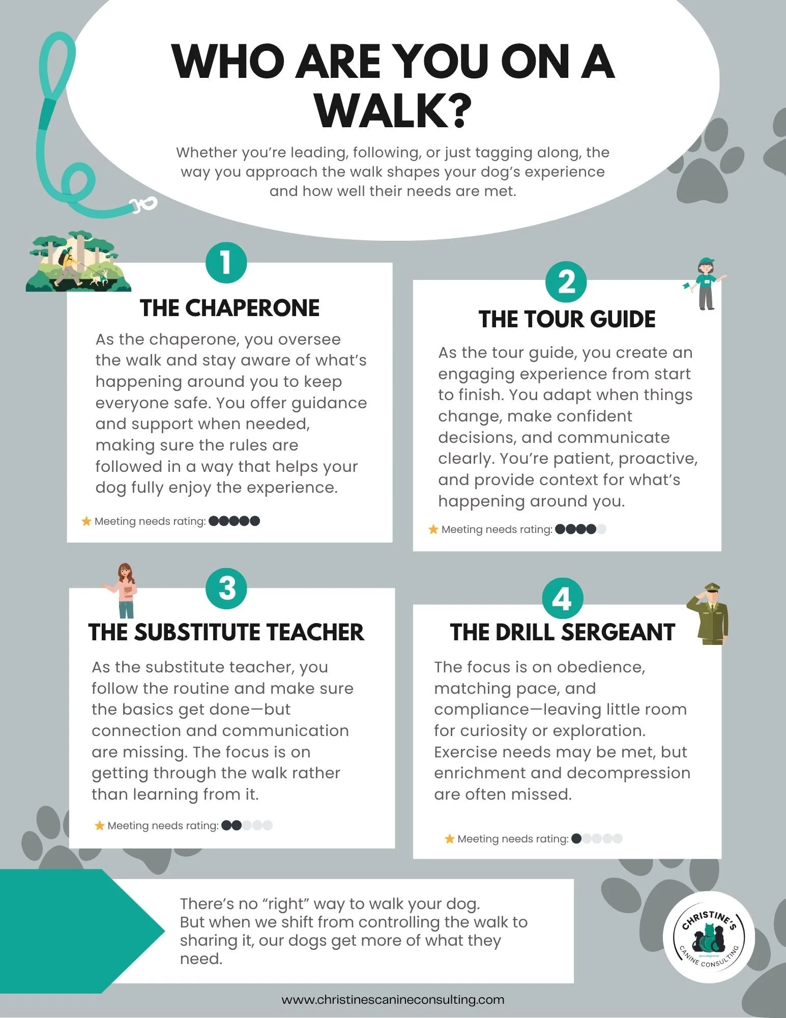 This quick visual breaks down four common “roles” we tend to fall into on walks — from Drill Sergeant to Chaperone — and how each one affects your dog’s experience.