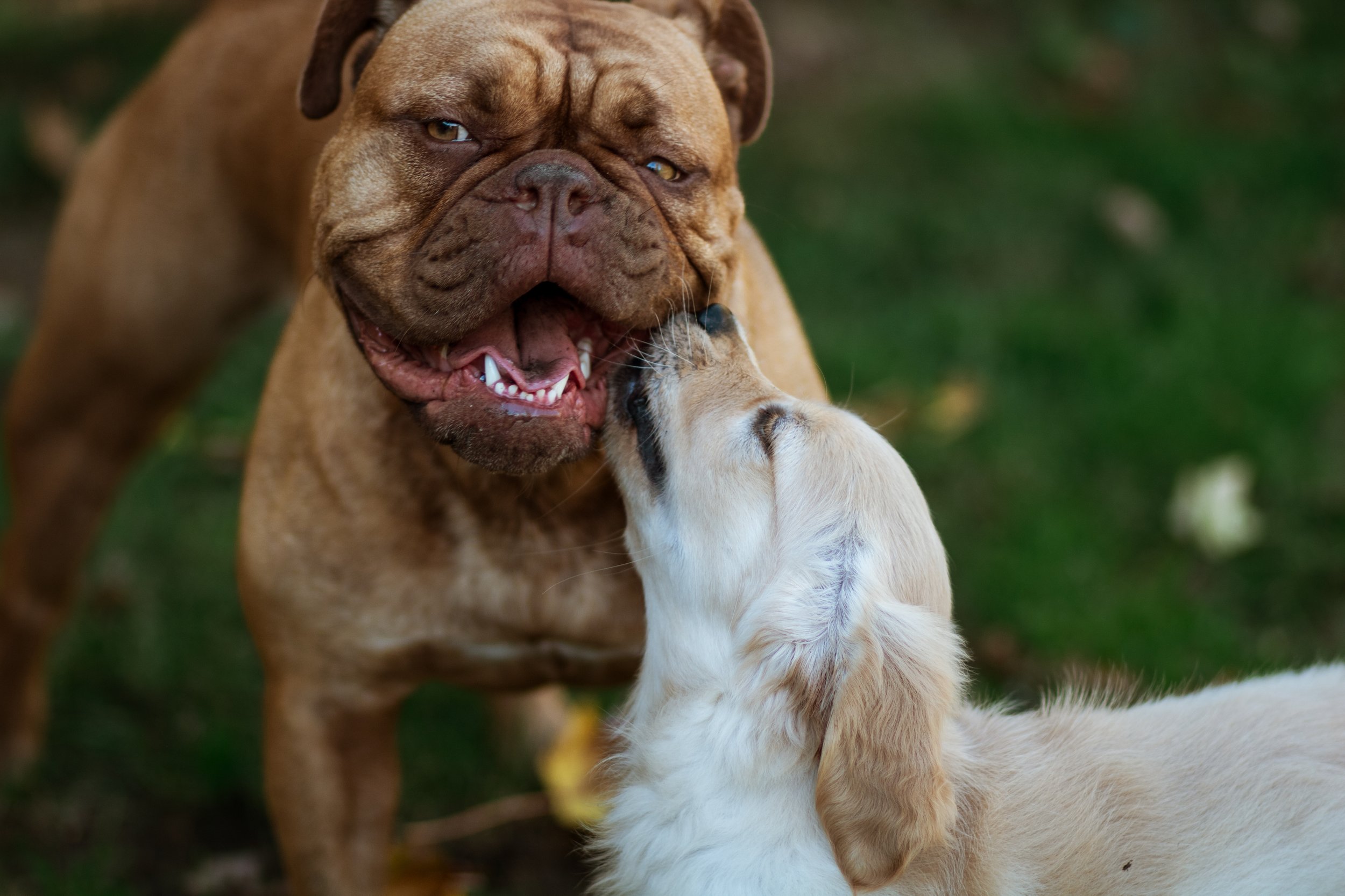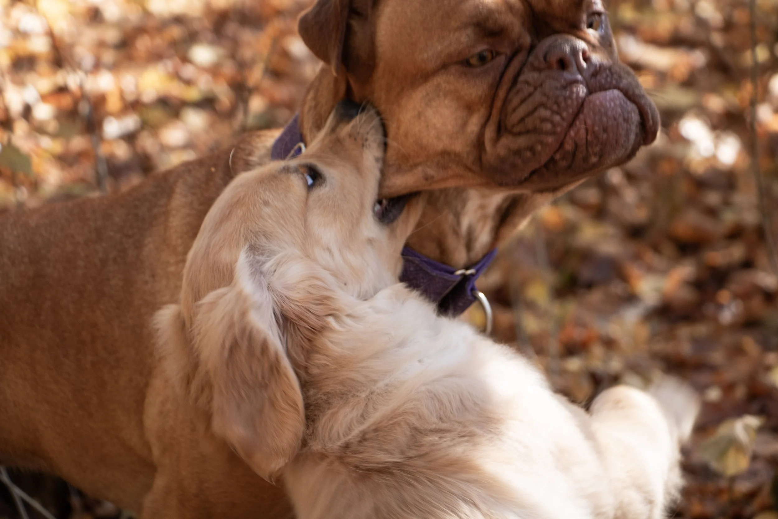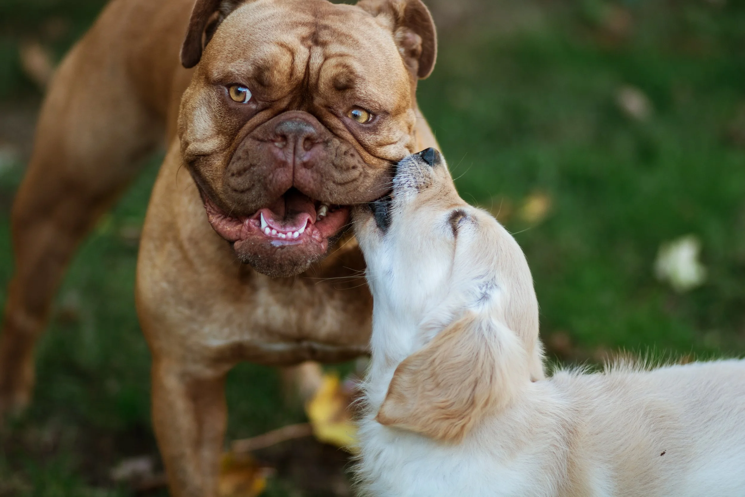 Dogs often interact around the mouth during play, grabbing lips, cheeks, ears, or loose skin. The contact itself doesn’t tell us whether an interaction is playful or uncomfortable — the body language that’s happening with it does.