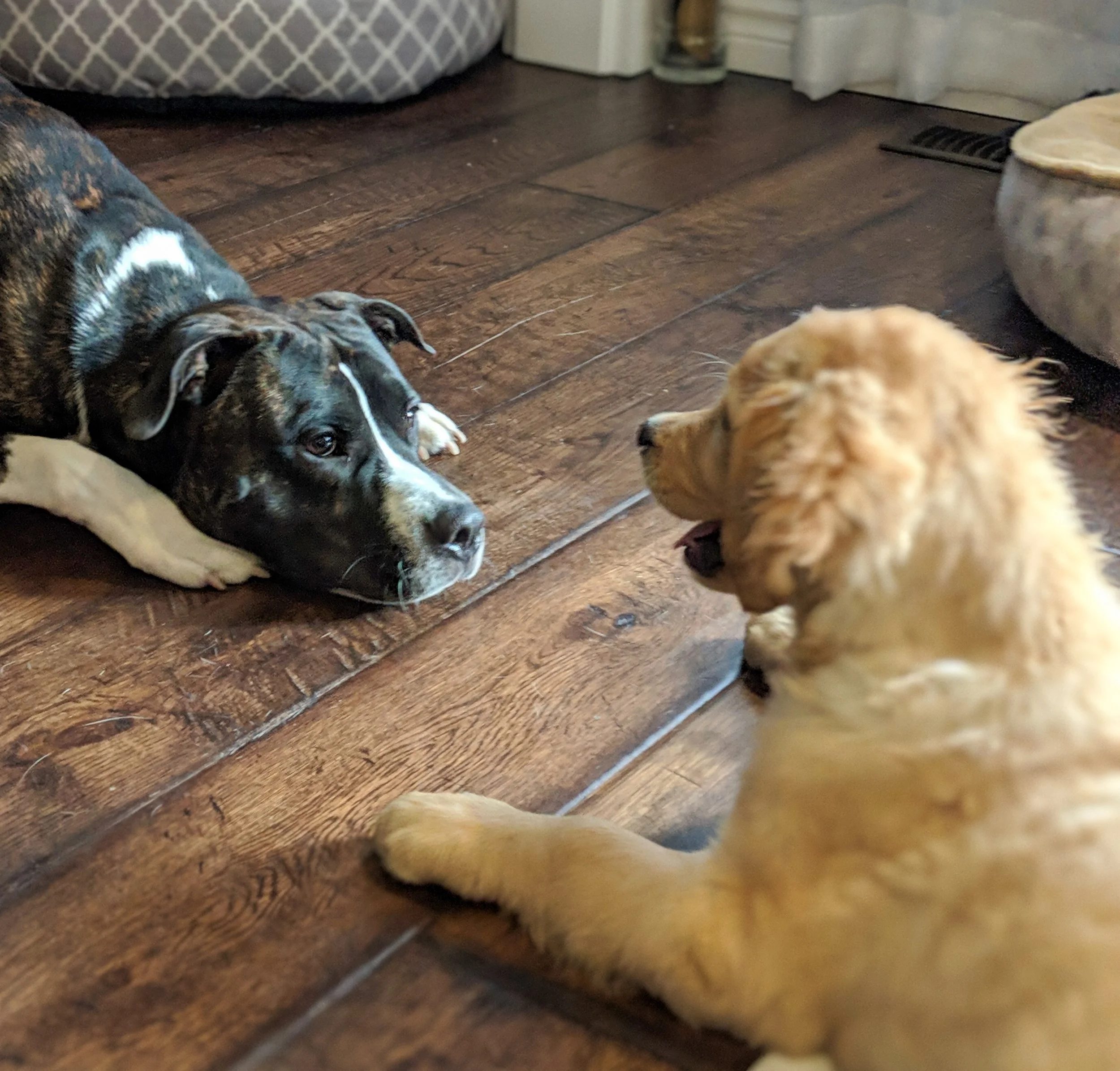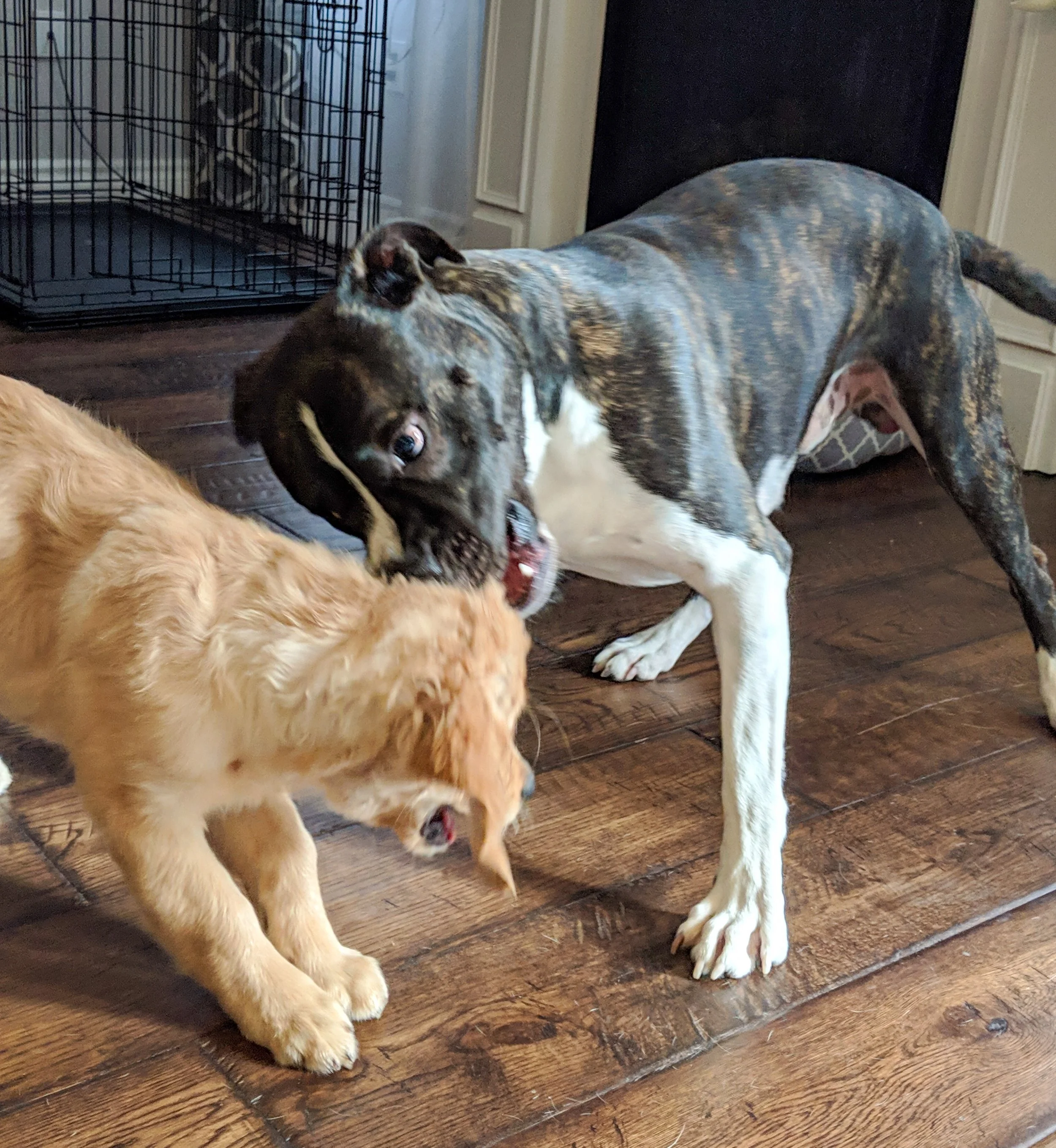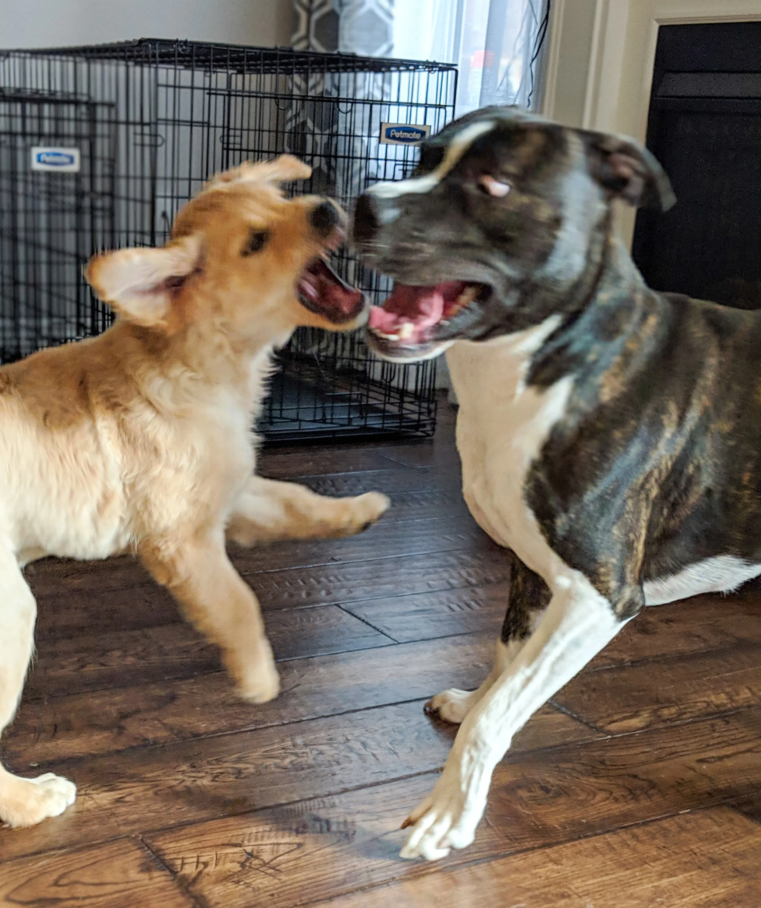 Hazel uses her front paws against the other dog’s shoulders to keep him at bay.
