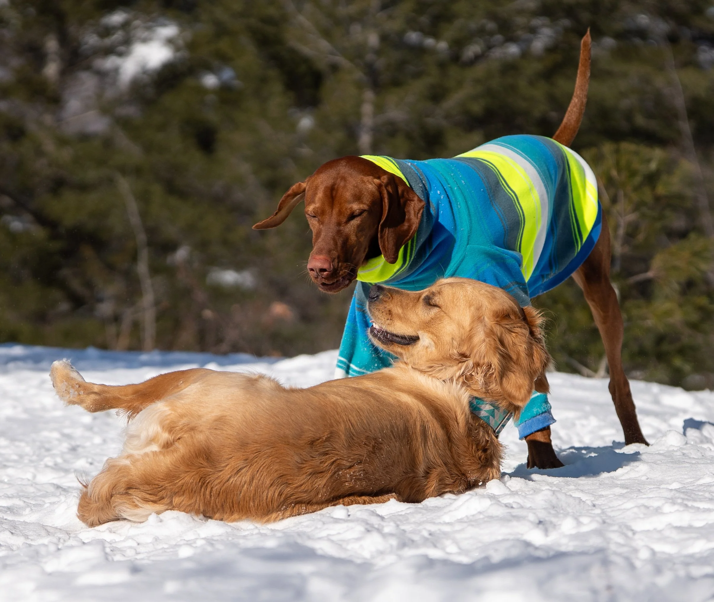 The Vizsla keeps pursuing Hazel, his focus on her face and neck.