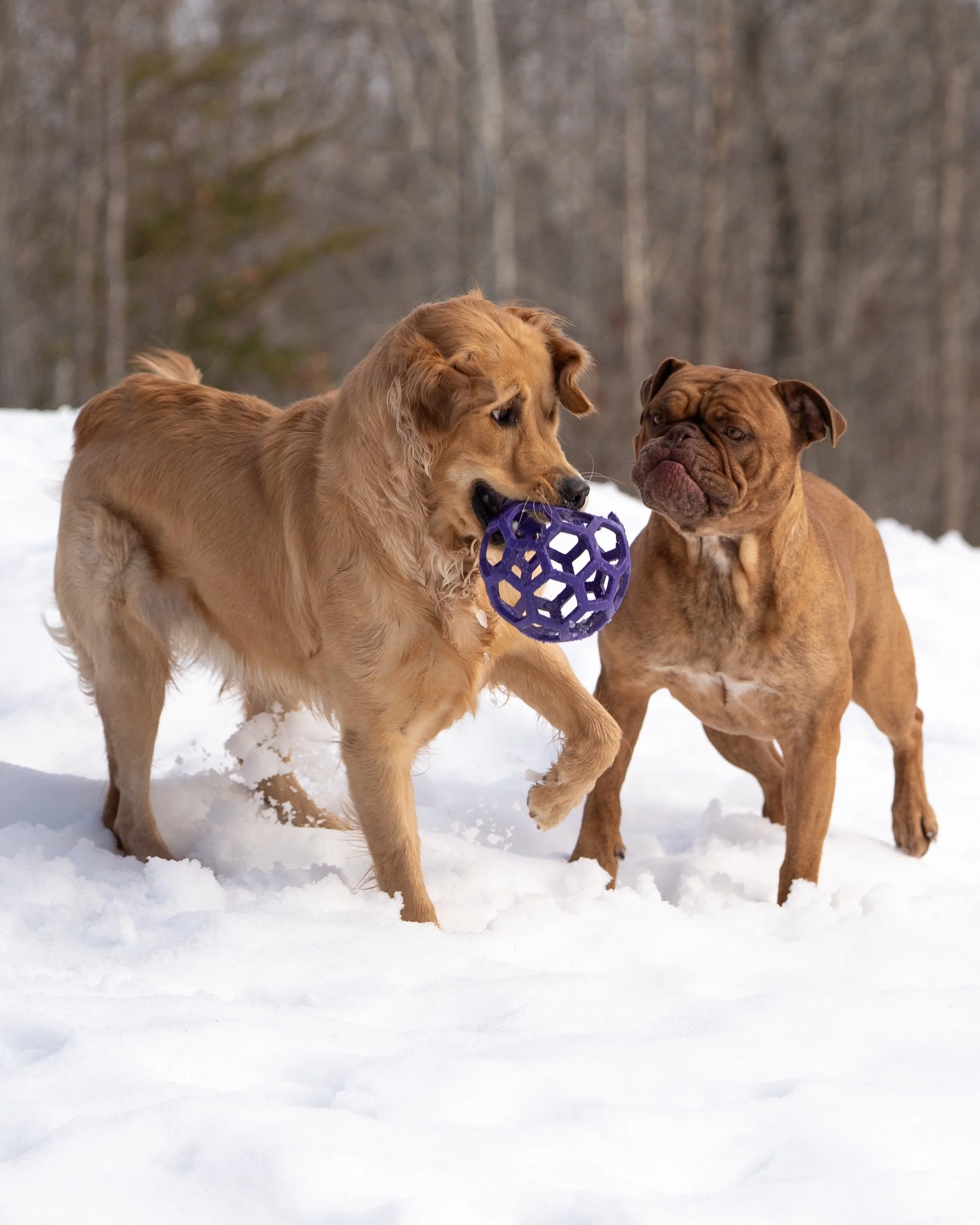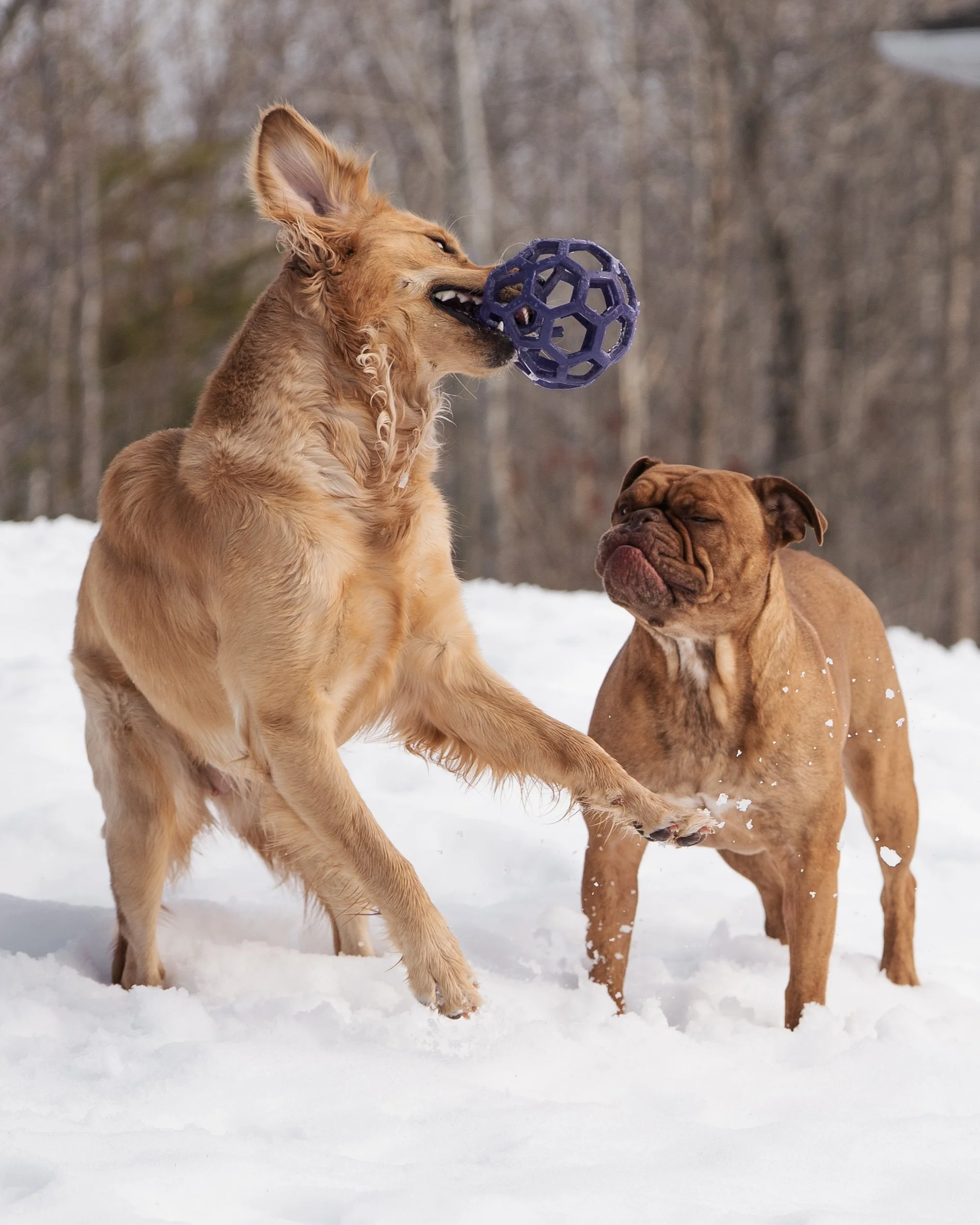 Toys can add a bit of social pressure during play. When one dog has a toy and another dog shows interest, both dogs often pause to assess each other’s intentions.